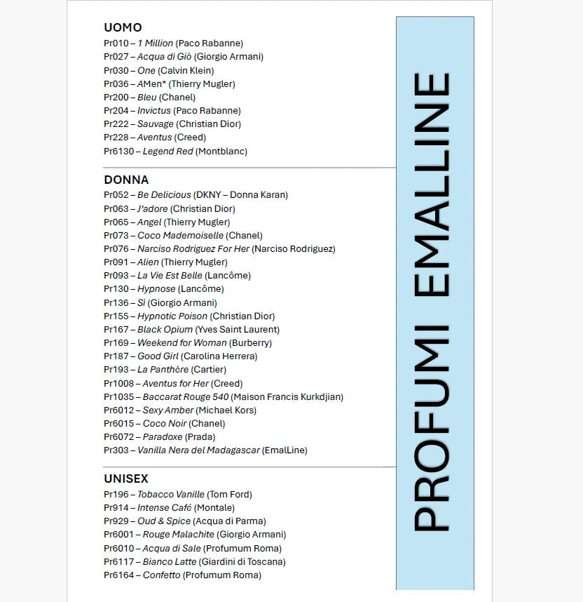 Guarda la foto con l’elenco numerato delle fragranze e indica nel messaggio al checkout (Note per il venditore) i tre numeri corrispondenti ai profumi che desideri inserire nel tuo cofanetto.