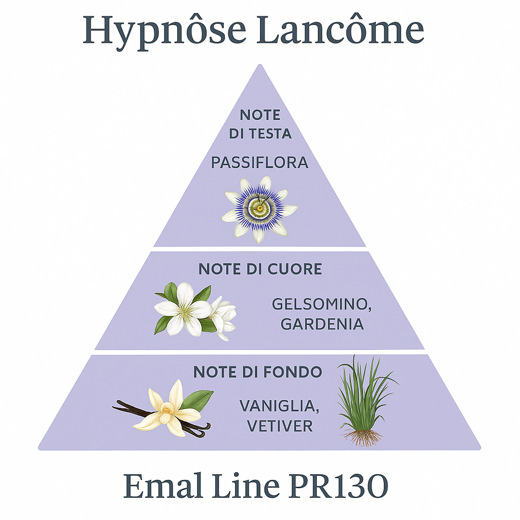 Emal Line PR130 è una fragranza sensuale e ipnotica, appartenente alla famiglia orientale vanigliata. L’apertura fruttata e passionale di passiflora introduce un cuore fiorito di gelsomino e gardenia. Il fondo avvolgente di vaniglia e vetiver regala calore, eleganza e una scia persistente, perfetta per la donna magnetica che vuole lasciare il segno.