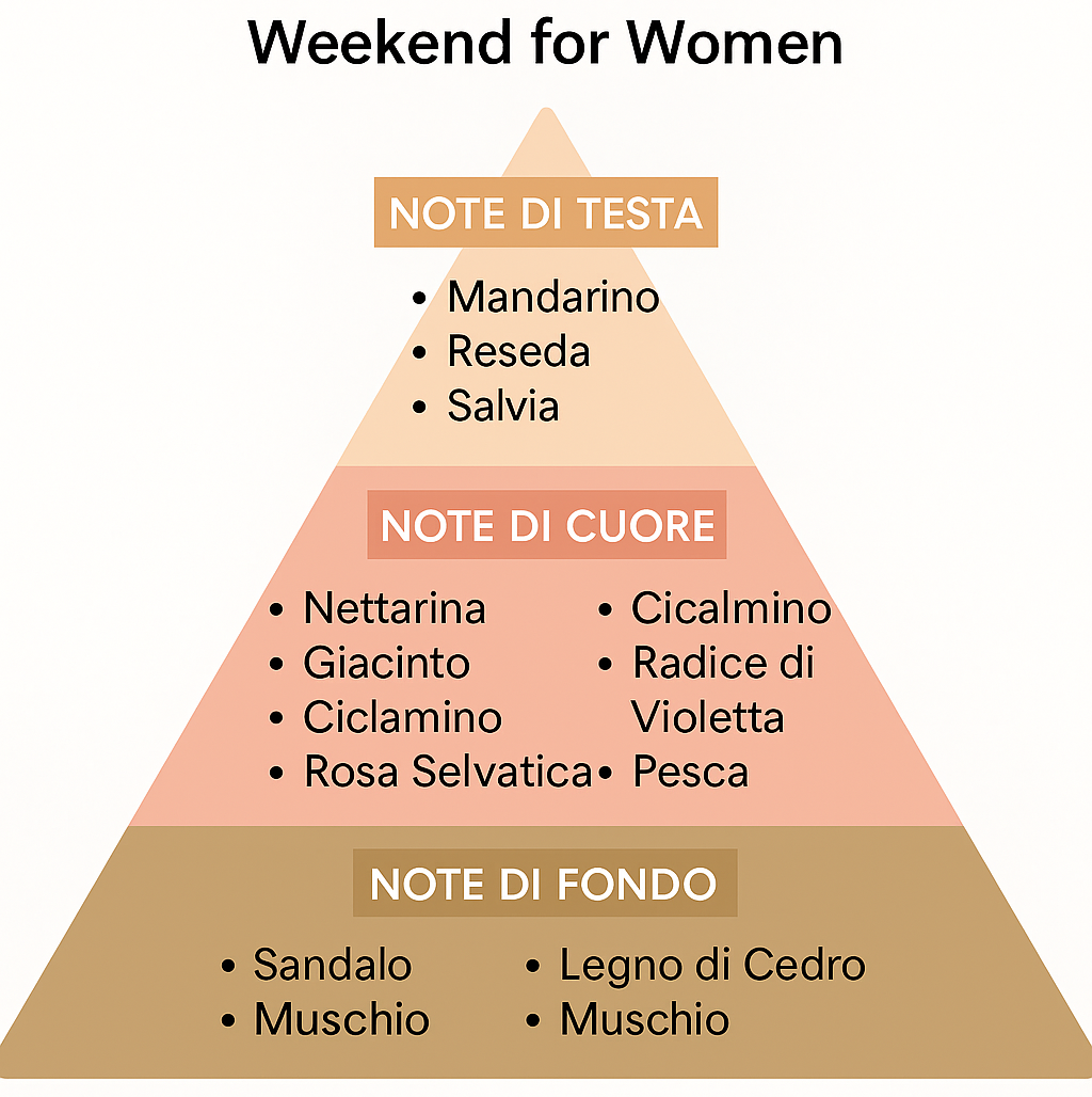 • Note di cuore: Rosa selvatica, Iris, Ciclamino, Nettarina, Pesca, Giacinto, Radice di viola, Reseda